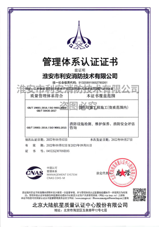 淮安市利安消防技术有限公司成立于二0一0年,目前满足2019年8月29日,应急管理部颁布《消防技术服务机构从业条件》,已在江苏消防网注册备案,可以从事消防设施的检测、维修保养、消防评估,且取得江苏省建委颁发的消防设施工程专业承包贰级资质证书,可从事消防设施安装。